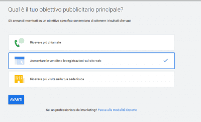 Google all’inizio ti chiederà quale tipo di campagna pubblicitaria vuoi attivare. Concedendoti tre opzioni: