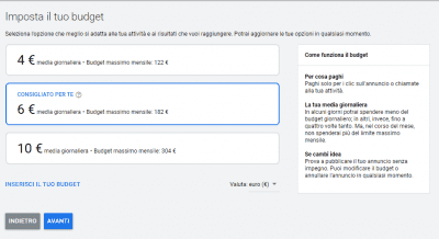 Google Ads viene anche incontro alle proprie disponibilità economiche, dato che è possibile stabilire un budget ed è anche possibile sospendere la promozione quando lo desideriamo. Quindi, in altre parole, offre un alto grado di personalizzazione della campagna pubblicitaria.