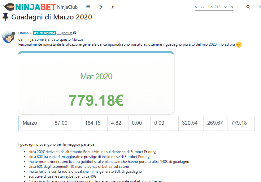 Sul Forum di Ninjabet è possibile visualizzare tante discussioni sui guadagni. Come si evince dall’immagine di seguito: